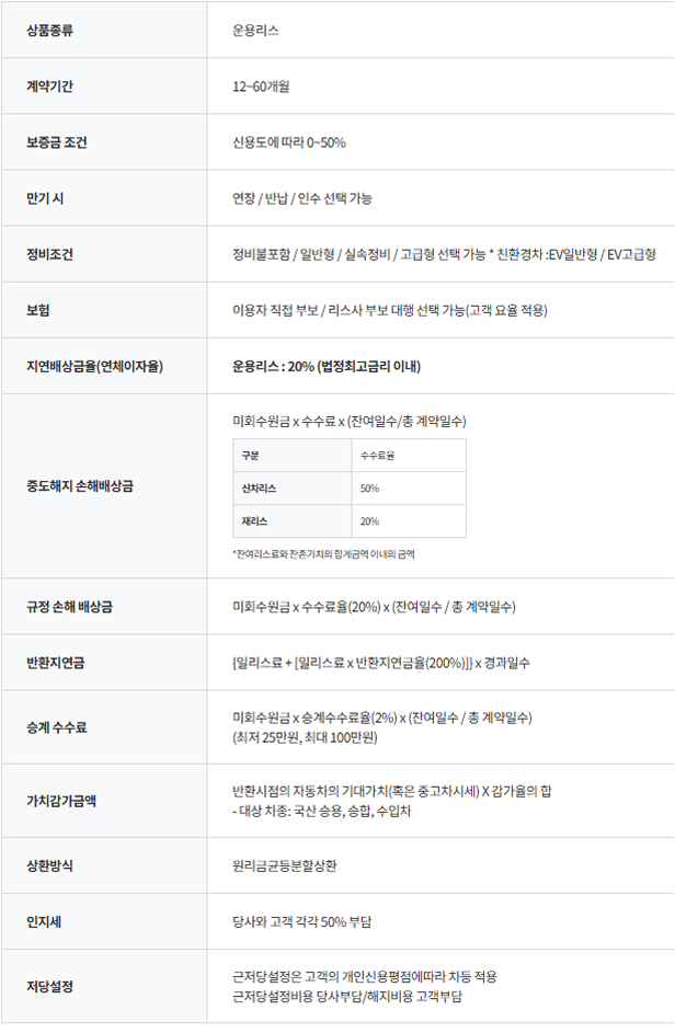 운용리스의 경우, 만기 차량 반납 시 사고이력 또는 약정주행거리 초과에 따라 별도의 감가비용이 추가로 발생 할 수 있으므로 차량 반납 시 유의사항을 꼭 확인하여 주시기 바랍니다.